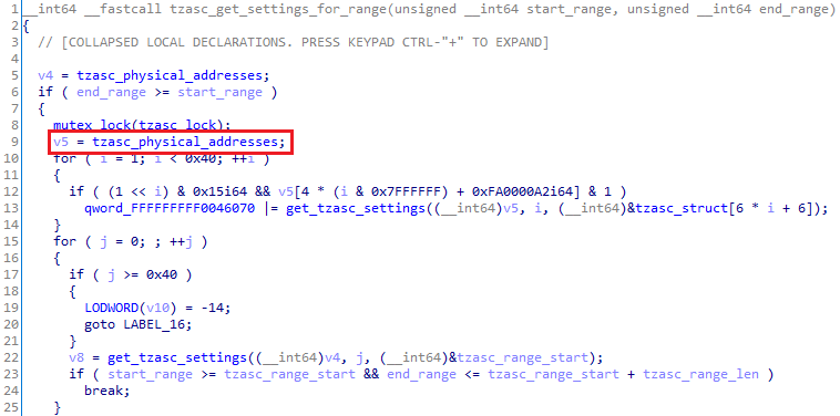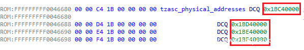 尽管这个函数看上去与我们要实现的攻击并不太相关,但我们注意到其中引用了一个名为tzasc_physical_addresses的结构,其中包含我们怀疑是4种不同的TZASC外设的物理地址。