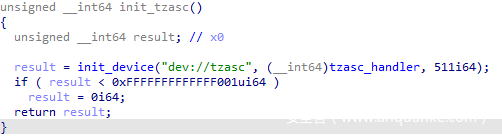 我们首先搜索字符串tzasc,然后查看TEE内核二进制文件中是否有匹配项。下图就是我们到达初始化函数的方式,这个函数为我们提供了TZASC处理程序的地址。