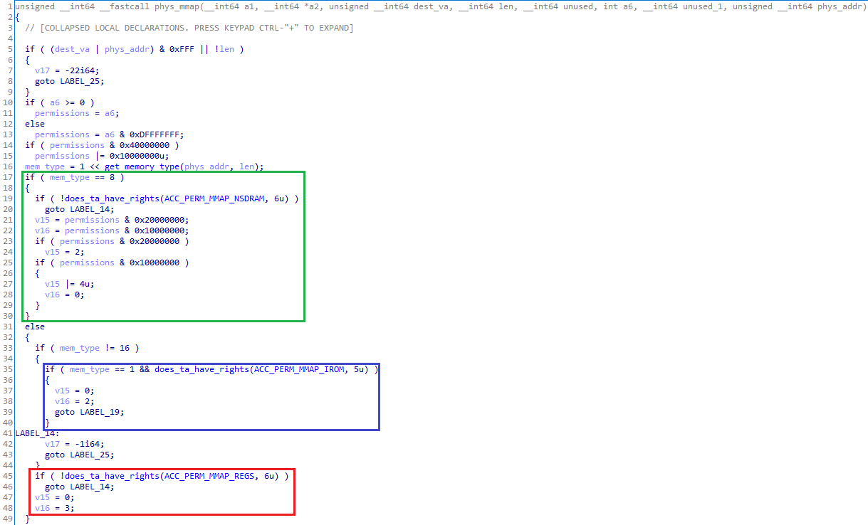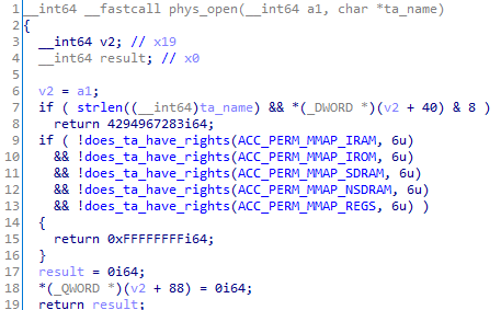 在第9-13行,代码会检查TA是否有权映射五个潜在区域中的至少一个,分别是内部RAM、内部引导ROM、安全DRAM、非安全DRAM和寄存器。如果有权限,则会成功执行。