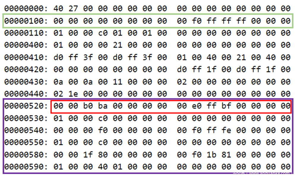 在系统中四个TZASC控制器的配置非常相似,这里我们仅举例分析一个。上图中绿色标出的代表区域0,这是我们在第一篇文章中说明的默认基础区域(0x0000000000000000-0x000000fffffff000)。紫色表示的是系统在特定时间配置的所有安全范围。每个安全范围包含两个8字节(低字节序),接下来是该属性的另外16个字节。最后,红色标出的区域是安全范围的开始和结束地址,这是TEE OS的范围(0x00000000bab00000- 0x00000000bffff000)。这也与/proc/iomem提供的信息相匹配: