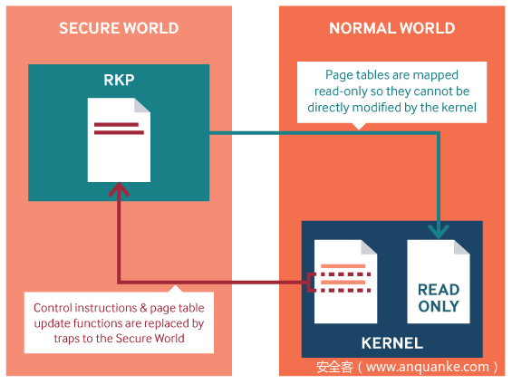 管理程序可以限制内存权限,这意味着,如果在第二阶段将某个页面映射为只读,那么即使该页面使用写权限映射,Linux内核也无法修改其内容。使用RKP,可以强制Linux内核内存中的某些安全相关结构只读,即使攻击者在内核上下文中执行了任意代码,也无法对其进行修改。