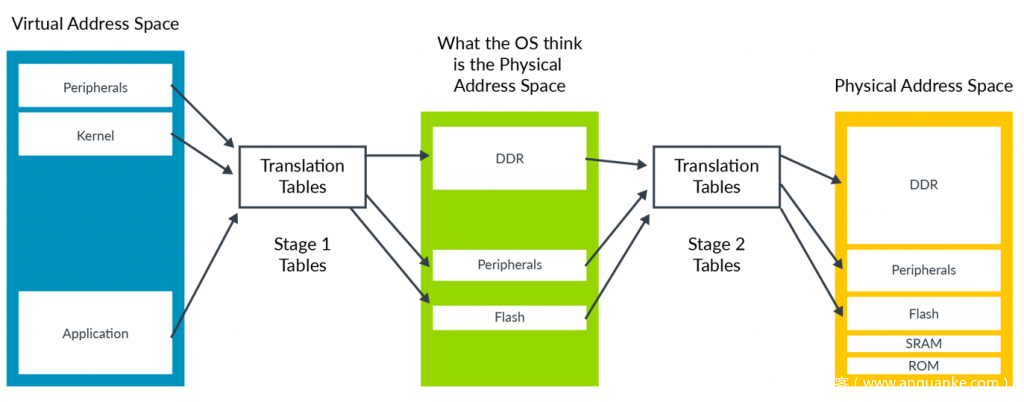 当ARMv8-A系统中存在管理程序时,会存在另一个阶段的转换表,其初衷是允许系统中具有多个guest操作系统。因此,攻击过程分为两个阶段。第一阶段是Linux内核执行,从虚拟地址转换为所谓的中间物理地址(IPA)。第二阶段是管理程序将IPA转换为最终的物理地址(PA)。