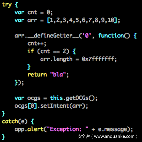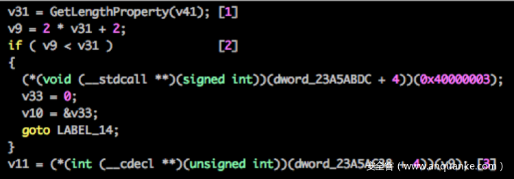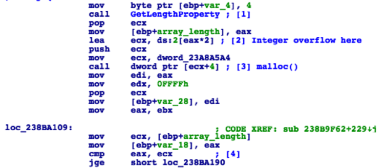 在上面的图2的[1]中,获取数组的长度属性并由攻击者完全控制。然后在上图中的[3]处,根据[2]计算的大小分配内存。最后,在[4]中,该长度用于溢出分配缓冲区的循环中: