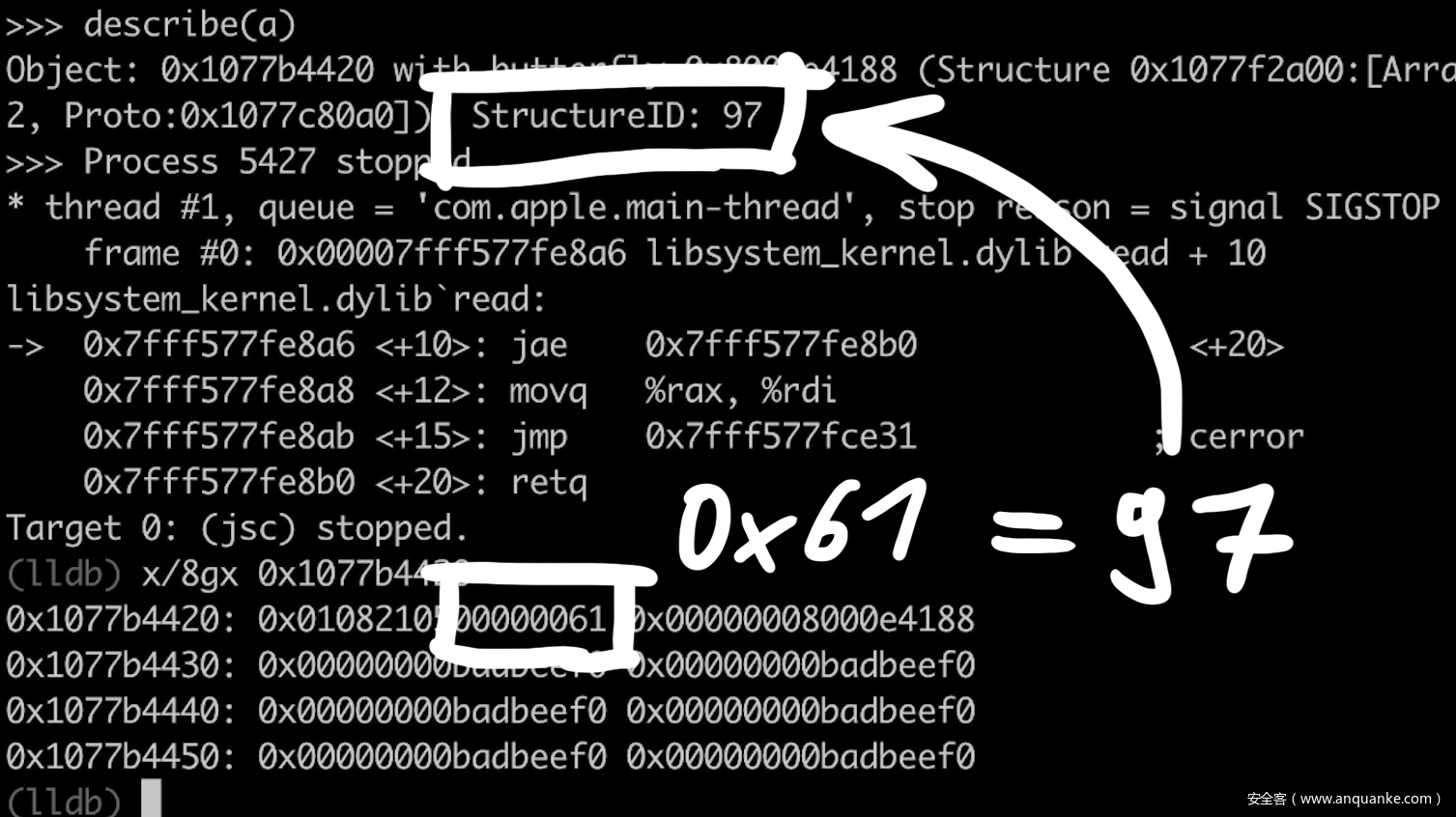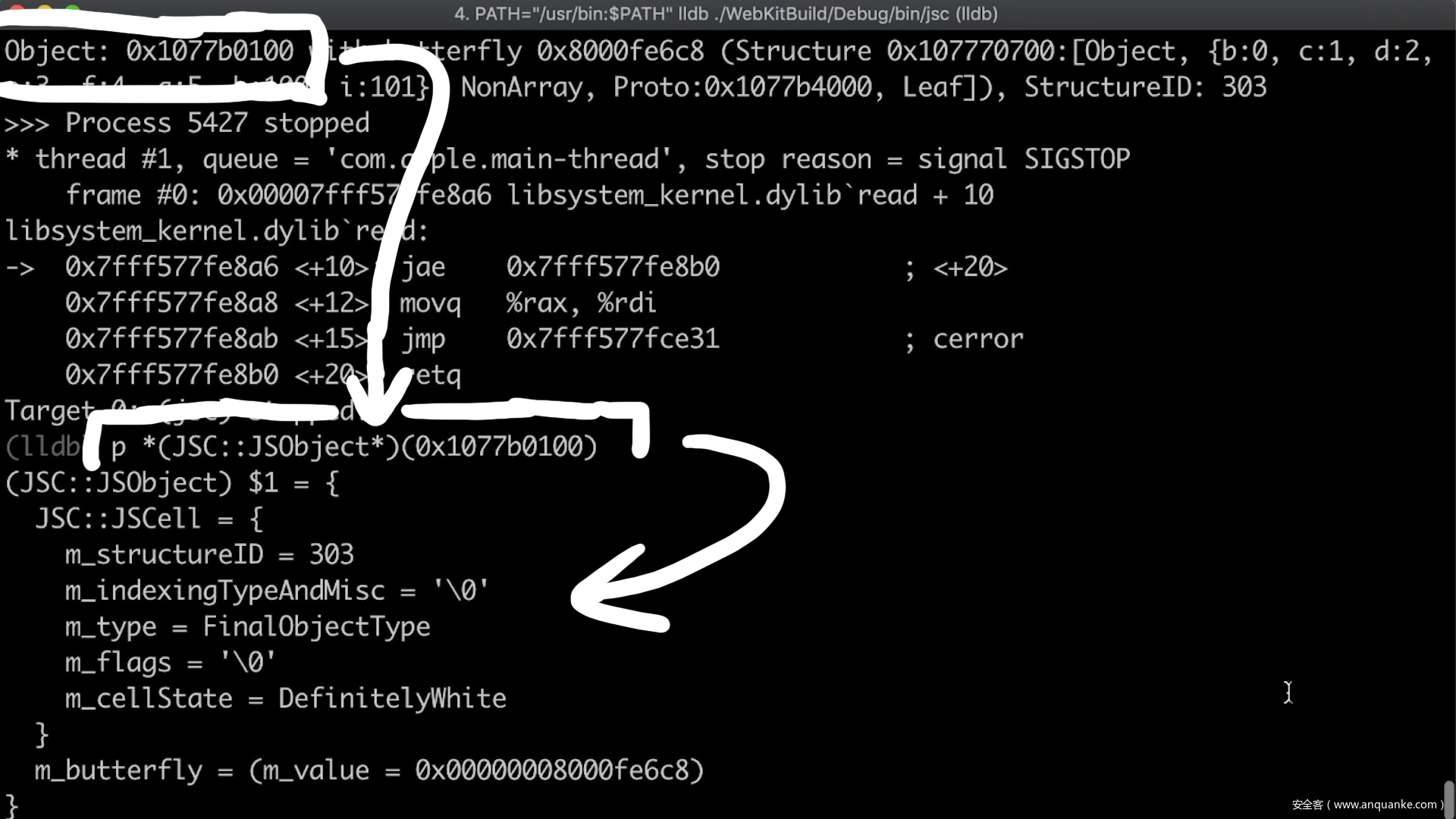 最后提一下,我们当然可以使用lldb的打印功能来使用调试版本的符号信息。如下图所示,我们可以看到属于JSCell头的StructureID及标志,并且可以看到蝶式地址是JSObject类的一部分。