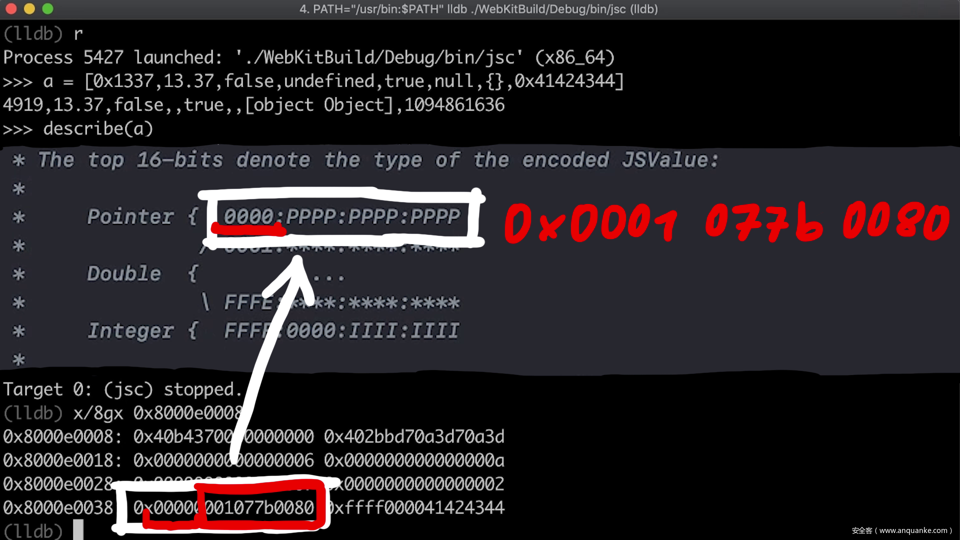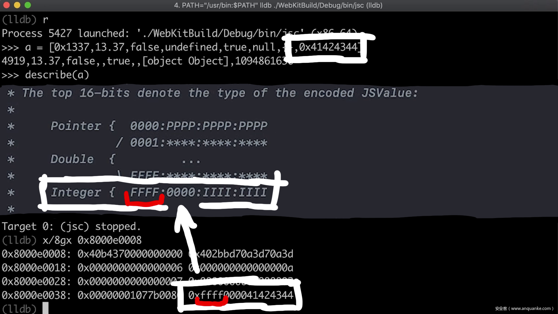 我们可以通过内存中的JSObject结构来了解JavaScriptCore内部实现。之前saelo已经在phrack的一篇文章中讨论过这方面内容,但我希望能利用上篇文章中介绍的调试器技术来分析这些知识点。在上篇文章中,我们快速过了一遍[1, 2, 3, 4]数组的内存结构,找到了这些数值,但我们还发现这些数值的高位全都被设置为0xffff,这里我们来了解一下为什么会出现这种情况。