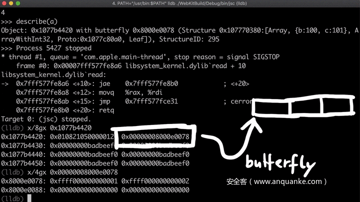 当观察describe()函数的输出时,我们可以看到所谓的“butterfly”(蝶式)地址。根据前面的内存分析结果,我们已经知道其中包含数组元素,但为什么会跟蝴蝶关联在一起呢?