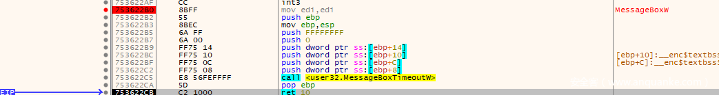 将编译好的程序通过x64dbg载入,在x64dbg中通过bp MessageBoxW来让函数暂停到Messagebox调用中。