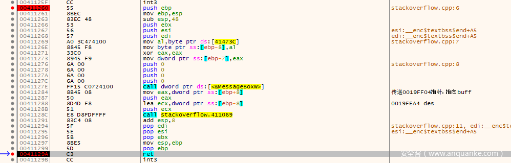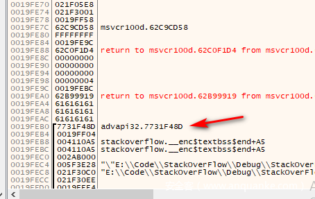 接下来我们在overflow函数返回前(0041129A)打上断点,并且运行到该处,可以看到EIP被改写为7731F48D。