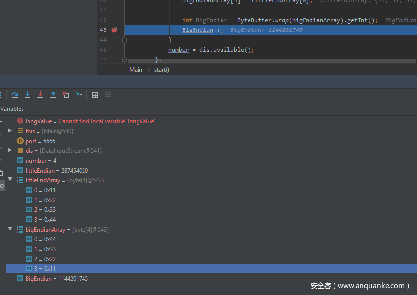 很清晰的看到在Windows(Little Endian)上发送的原始数据为0x44332211而内存表示为0x11223344。但是我们的Java平台是Big Endian,BigEnd上的对0x44332211数据的内存内存表示0x44332211。