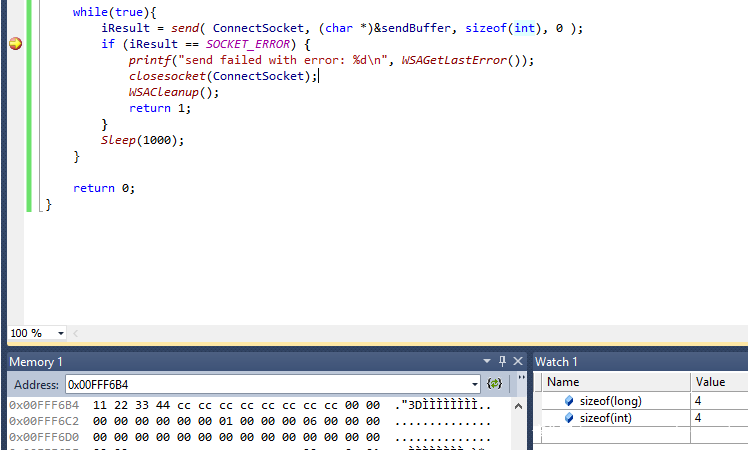 iResult = send( ConnectSocket, (char *)&sendBuffer, sizeof(int), 0 );