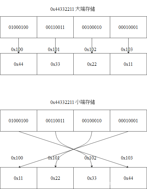 | Big Endian的十六进制表示 | 0x44 | 0x33 | 0x22 | 0x11 |