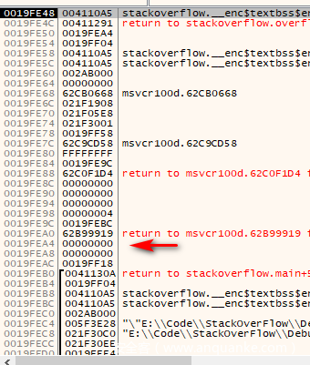 可以从上图看到传递给strcpy的参数,des(0019FEA4)和buf(0019FF04)指针。而这时的栈没有被改写,如下图所示,指针指向的是des指针。