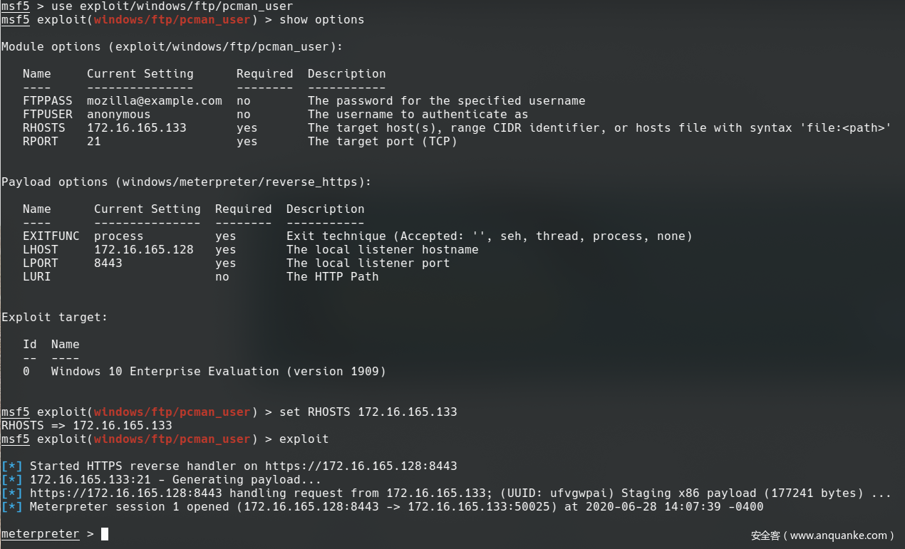 include Msf::Exploit::Remote::Ftp表示上面的脚本需要与FTP服务的连接功能。在此部分中def initialize(info = {}),提供了与漏洞利用有关的信息。例如部分,Payload并Targets概述了需要调整的内容。本节def exploit隐含一系列漏洞利用程序,类似于我们上面描述的一组功能。