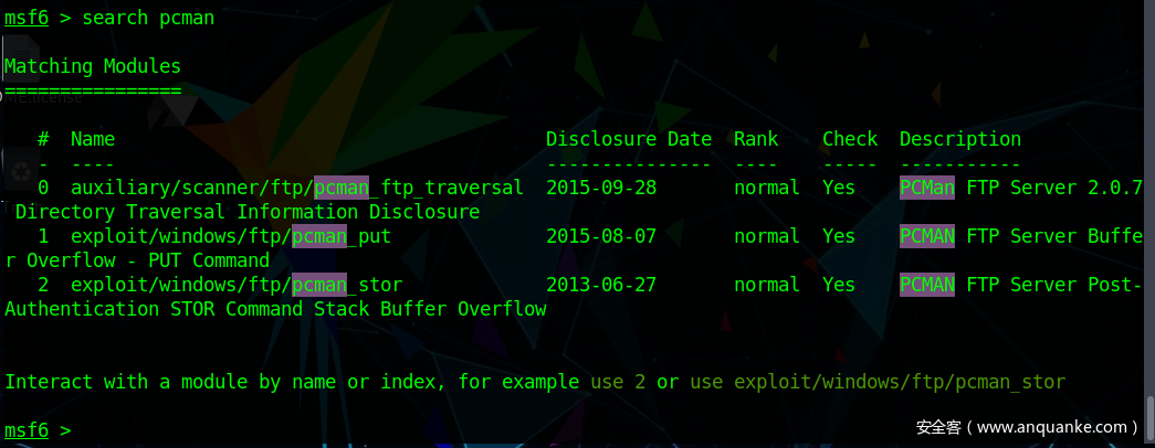 在本文中,我们将之前编写漏洞即PcmanFTPserver转换成metasploit模块。如果查看MSF漏洞,则利用有PcmanFTP服务器漏洞,但该漏洞仅适用PUT和STOR命令,而我们创建漏洞位于User命令中。同时此命令是不需要登录即可利用,所谓开箱即用。