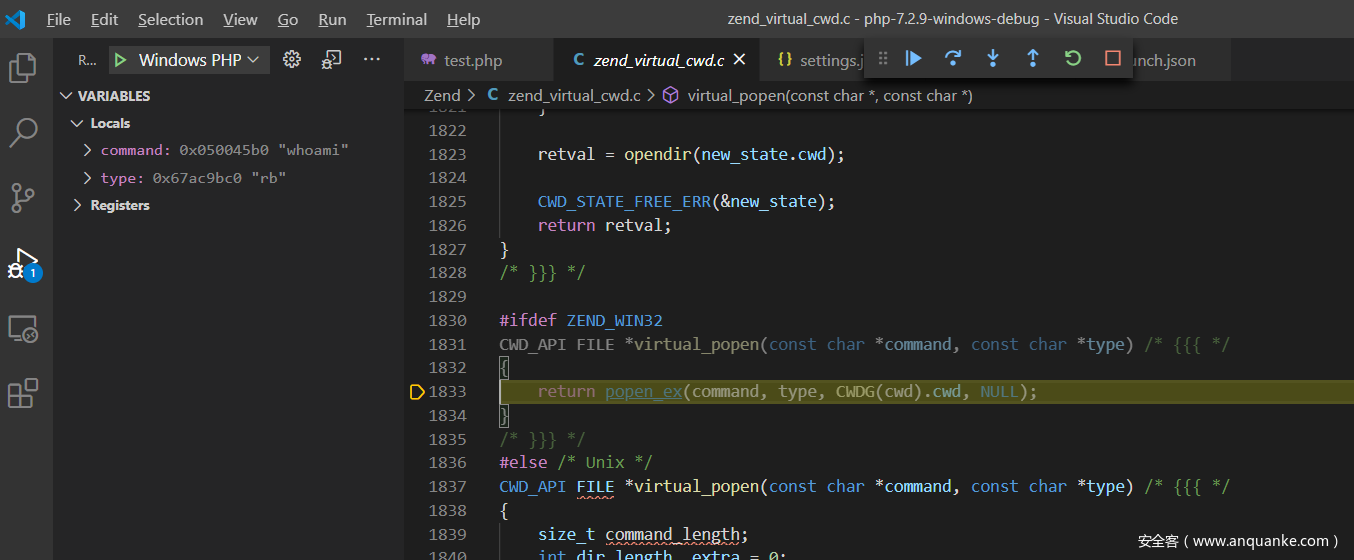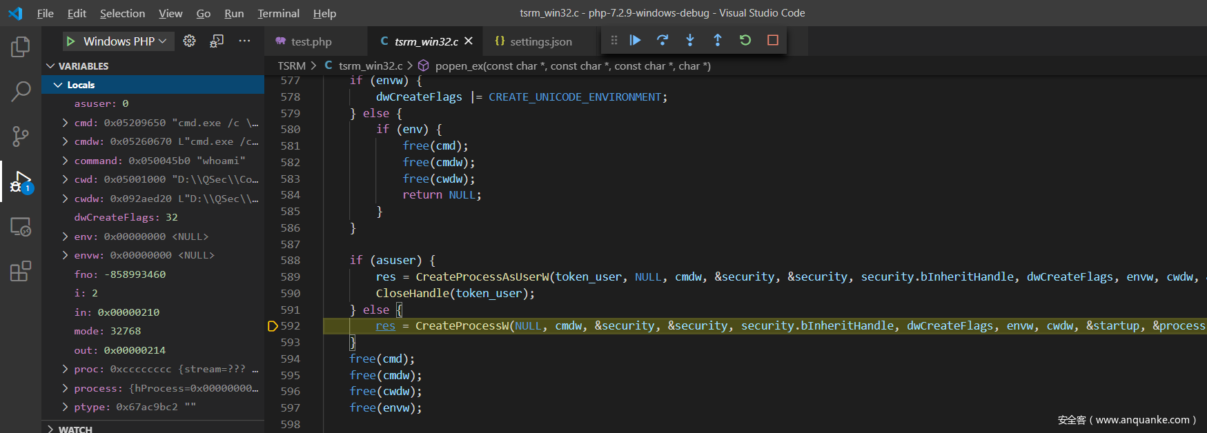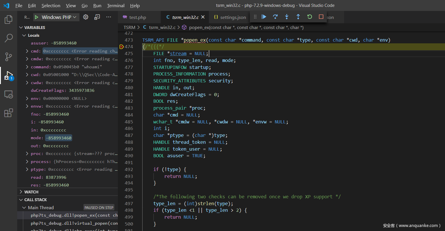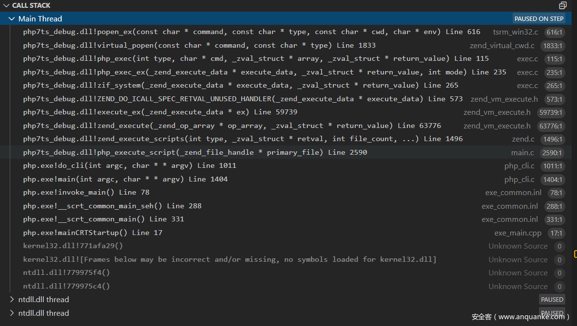 F11步入popen_ex()函数实现:TSRM\tsrm_win32.c:473
