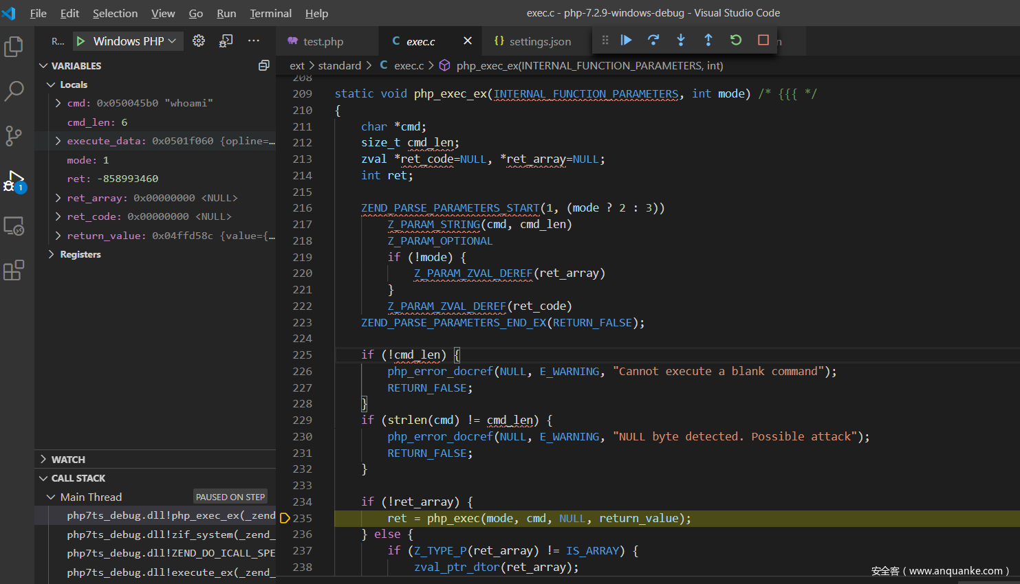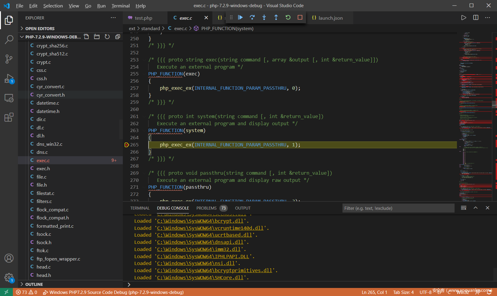 在ext/standard/exec.c:265中对system()函数实现入口处下断点,F5启动调试,运行至断点处