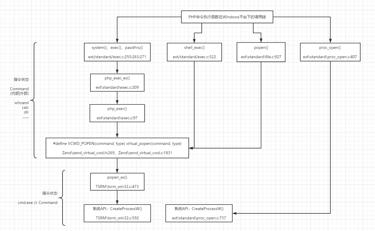 同理,按照上述整个审计思路,可整理出PHP常见命令执行函数在Windows平台下的底层调用链