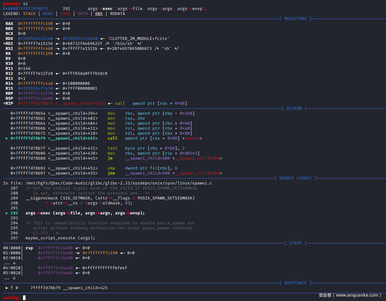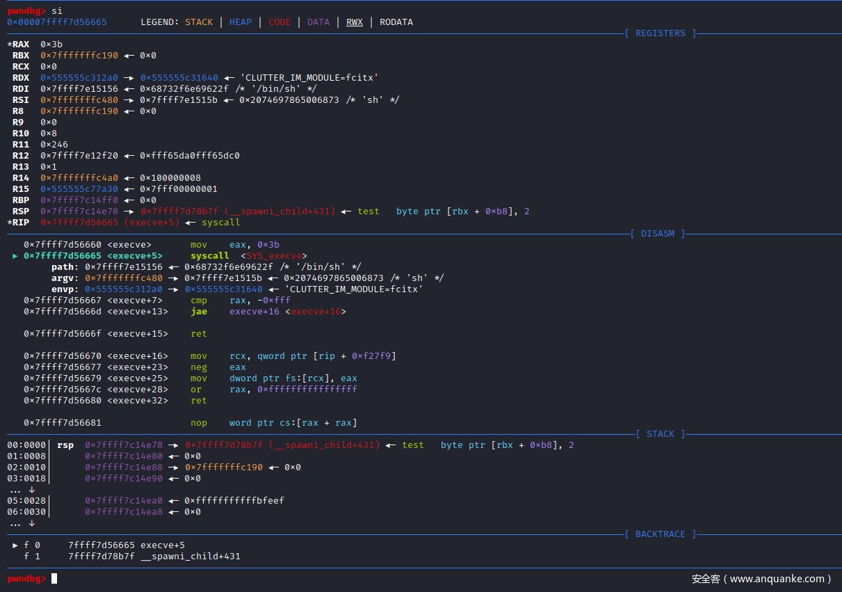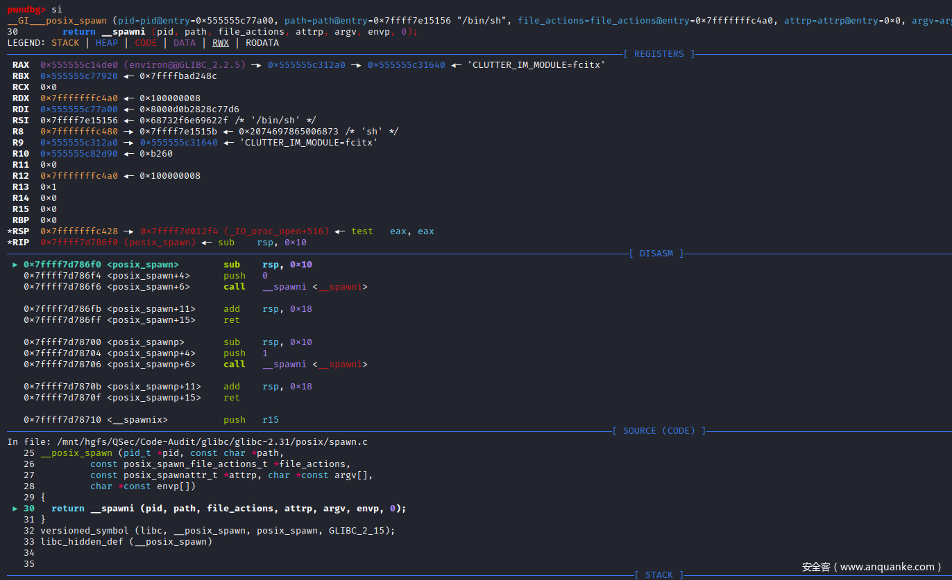 RSP  0x7ffff7c14ff0 —▸ 0x7ffff7d789d0 (__spawni_child) ◂— push   rbp