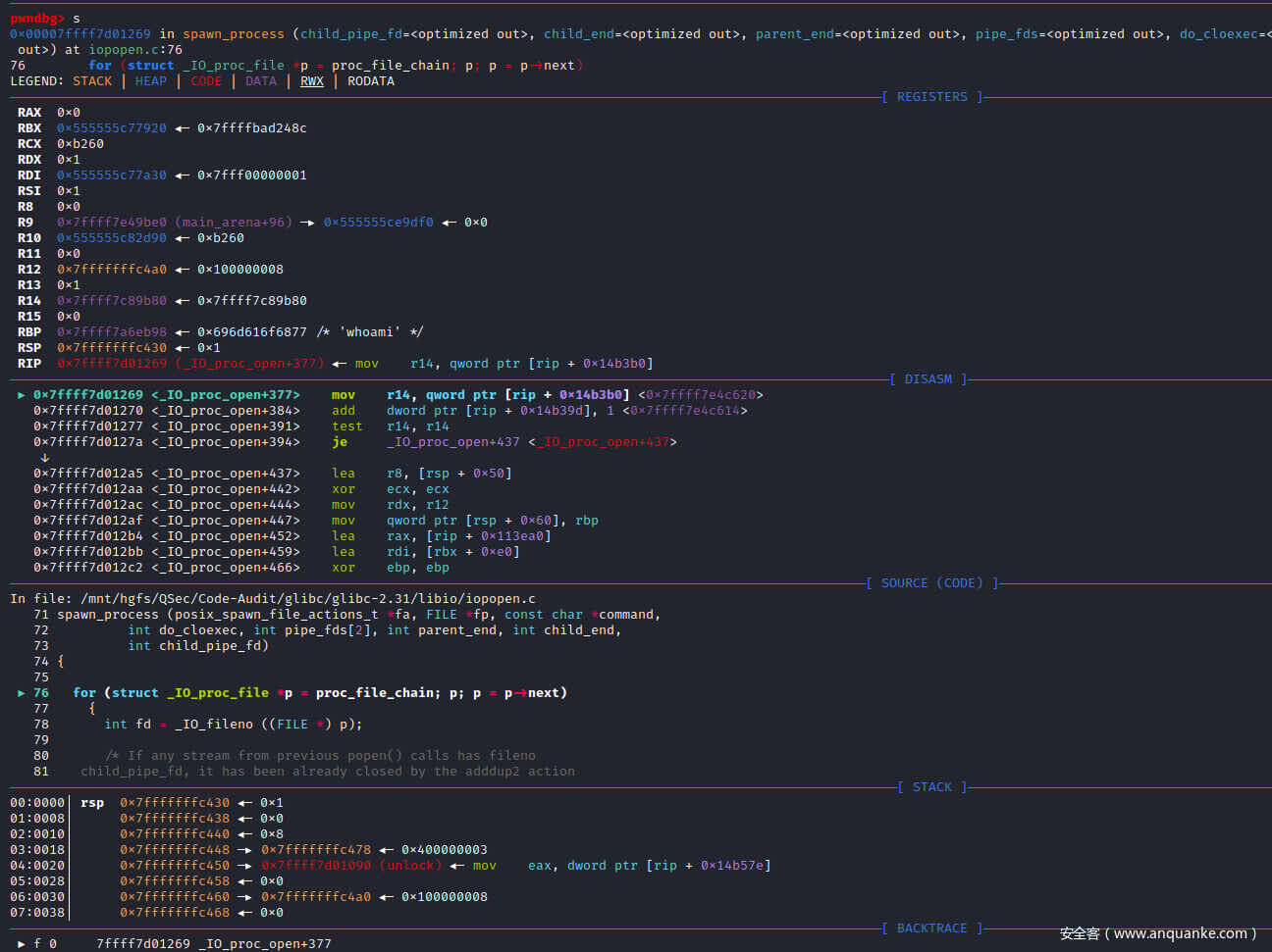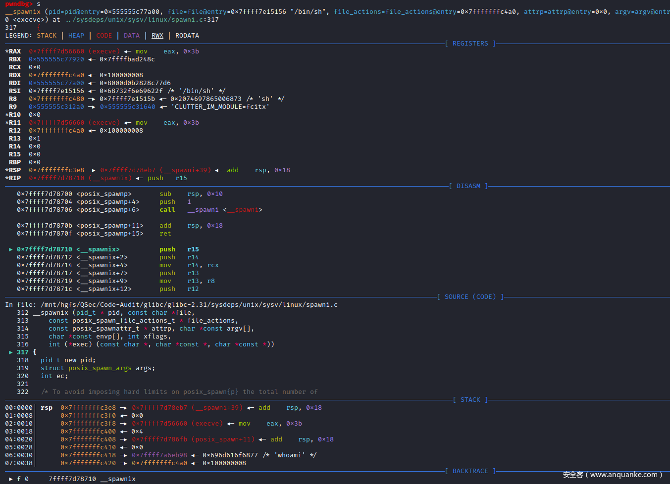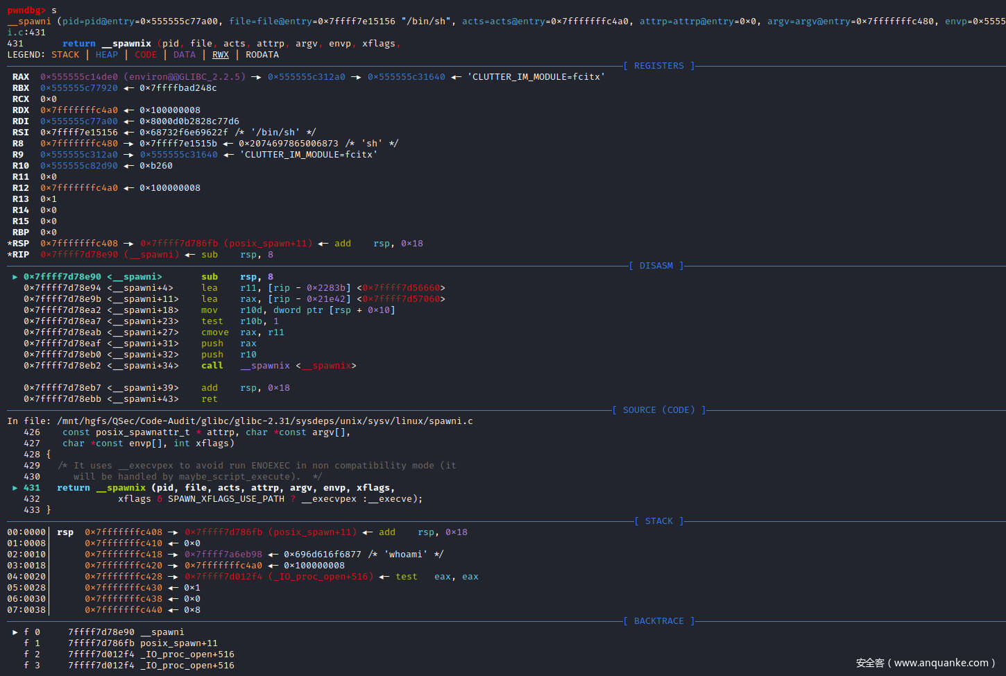RSP  0x7ffff7c14ff0 —▸ 0x7ffff7d789d0 (__spawni_child) ◂— push   rbp