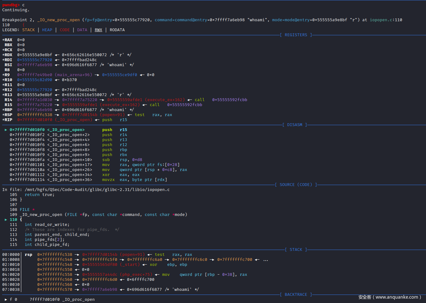 既然这两种猜想都不对那么*virtual_popen()中的poen()函数是由谁实现的,如果你对Linux平台熟悉的话,就会知道这里的poen()函数是在Linux下共享链接库glibc中实现的。