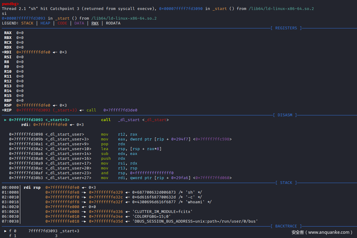 捕捉点设置完毕后,就可以步入执行execve()函数系统调用,查看此时的所有进程的栈调用情况