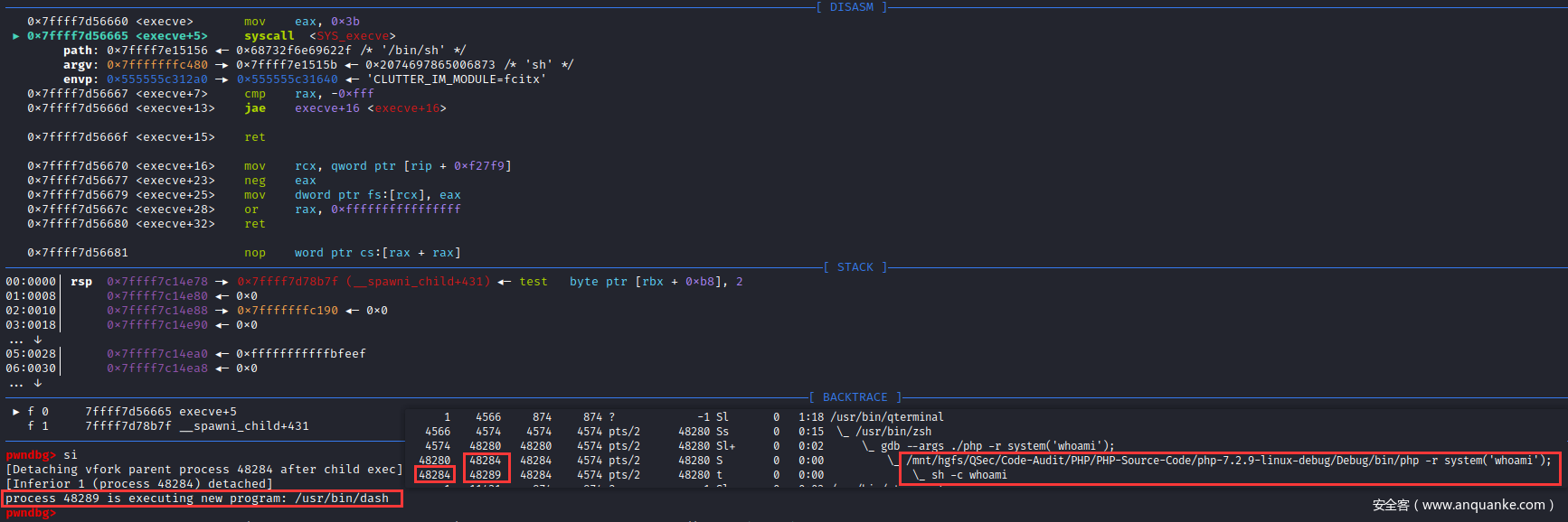 执行execve()函数系统调用:成功创建子进程/bin/sh->/bin/dash