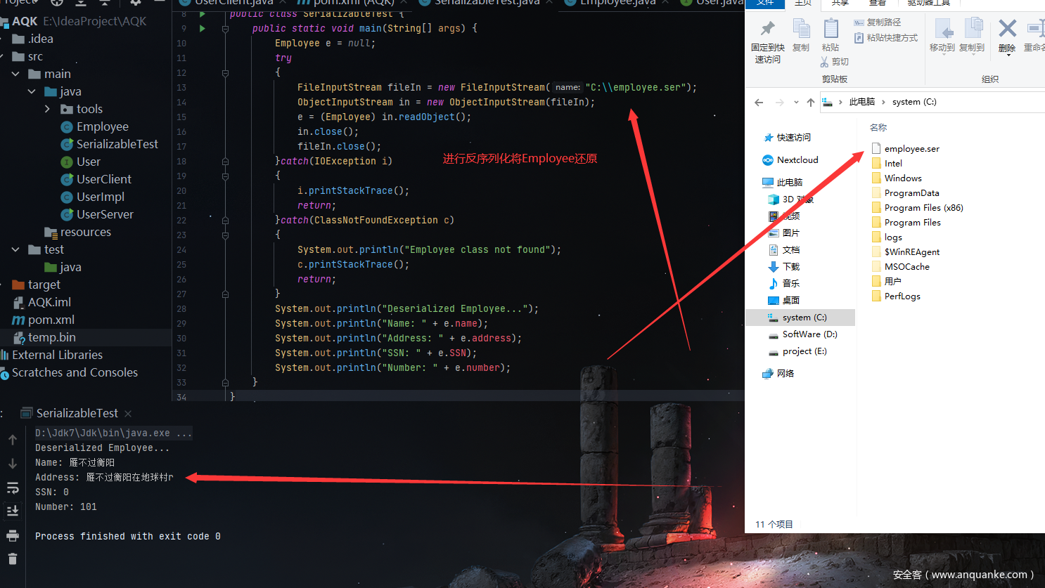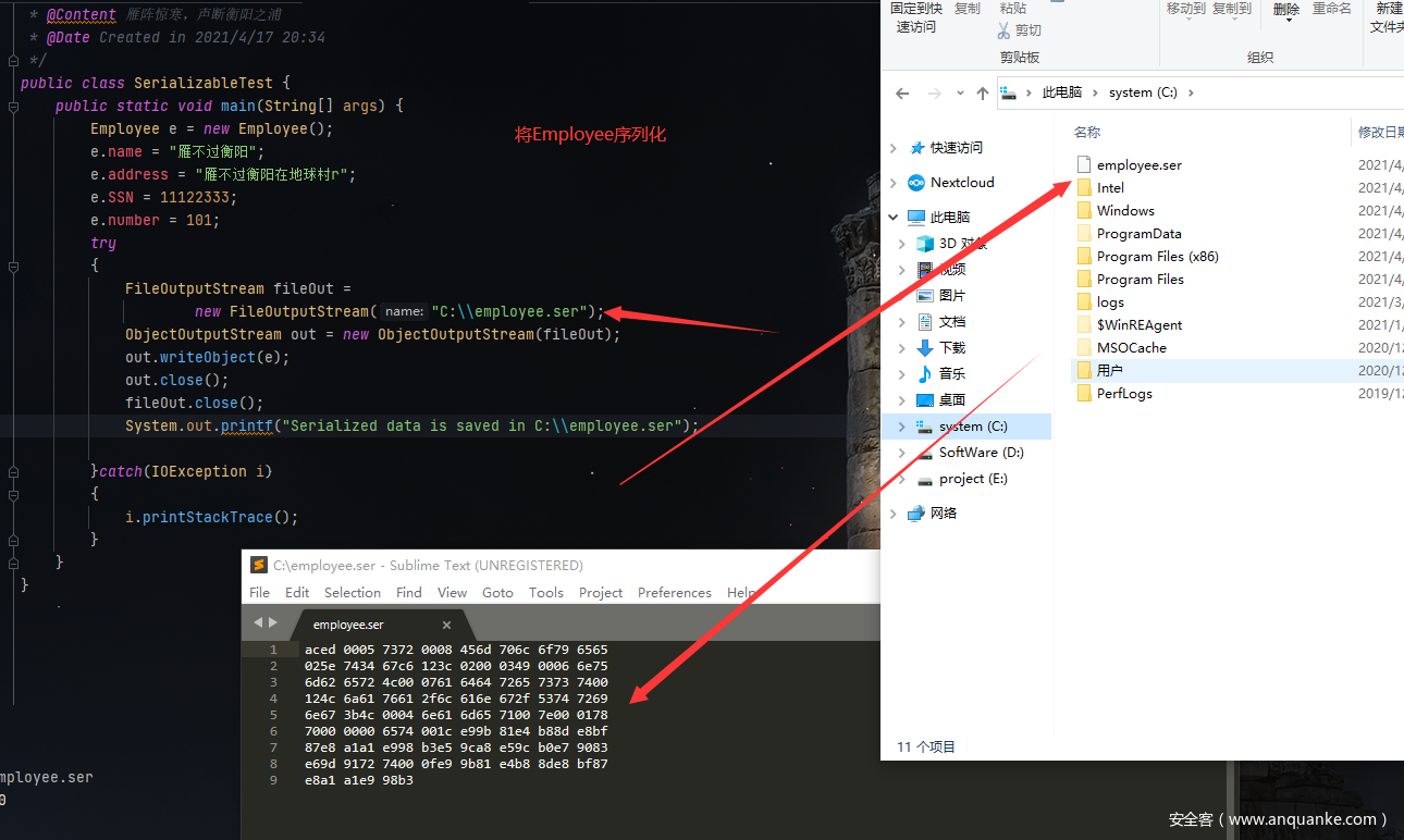 反序列化:将序列化对象写入文件之后,可以从文件中读取出来,并且对它进行反序列化,也就是说,对象的类型信息、对象的数据,还有对象中的数据类型可以用来在内存中新建对象。
