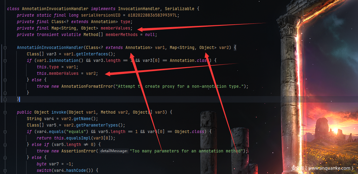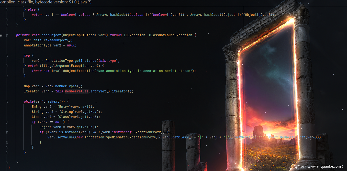 在1.8中这个类的readObject()方法重新赋值变为var11 = (new AnnotationTypeMismatchExceptionProxy(var11.getClass() + "[" + var11 + "]")).setMember((Method)var5.members().get(var10));