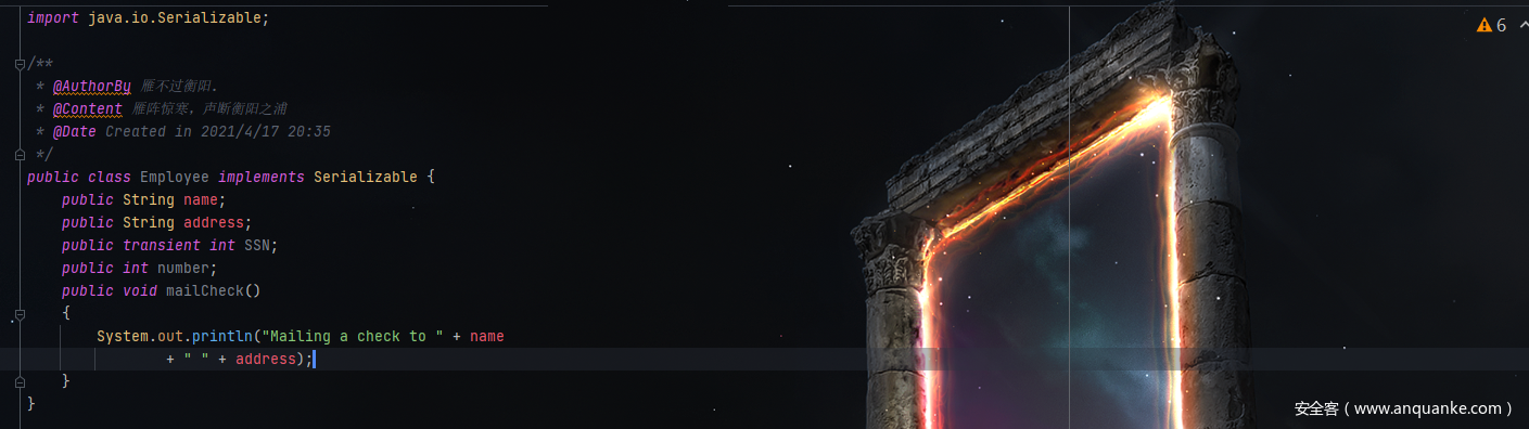为了演示序列化在Java中是怎样工作的,我将使用之前教程中提到的Employee类,假设我们定义了如下的Employee类,该类实现了Serializable 接口。