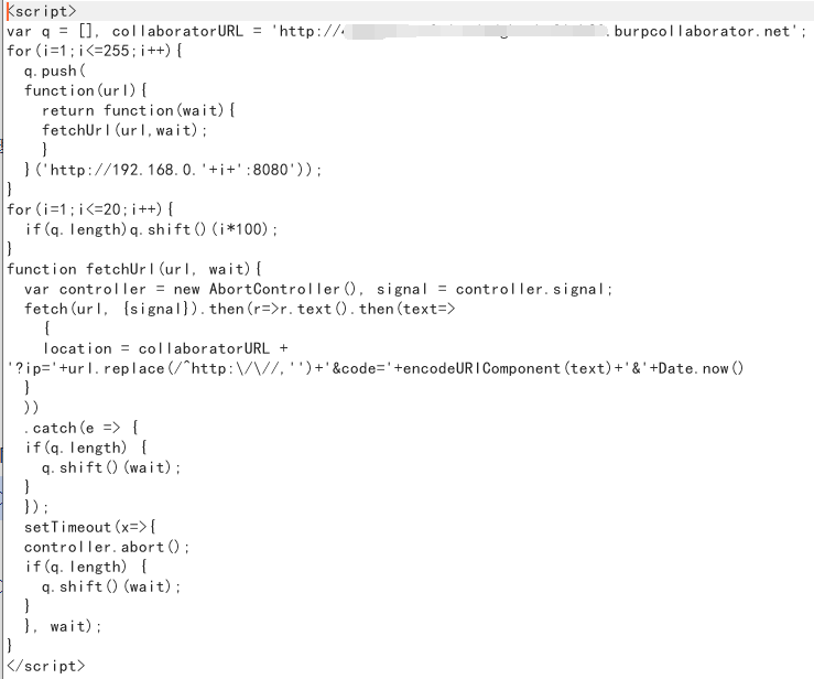 我们需要扫描内网,所以我们在Exploit Server编写这样的脚本投放给受害者