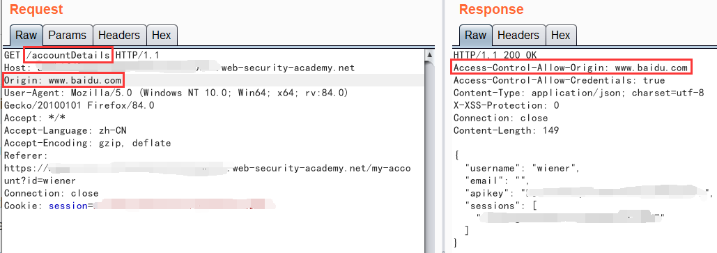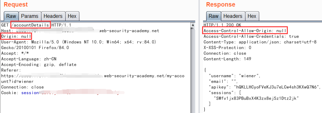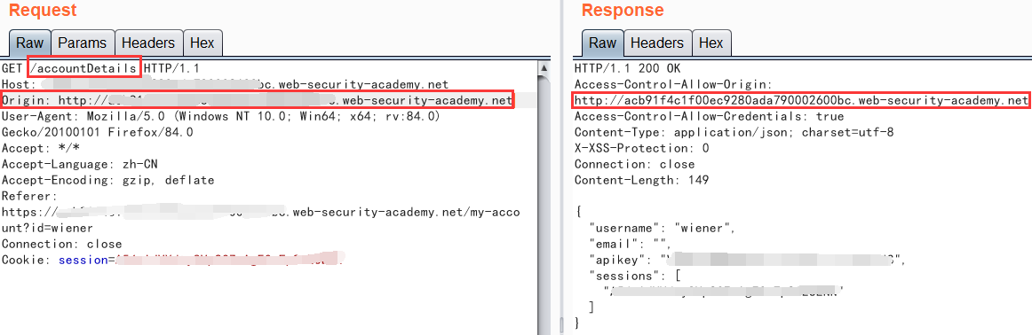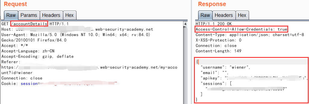 因为响应包中是包含这样的头的,说明请求源是被允许的并且允许包含cookie。而且还能看出是允许来自任意来源的。所以我们可以跨域访问资源,这样我们就可以访问一些带有敏感信息的资源了,例如构造这样的payload。