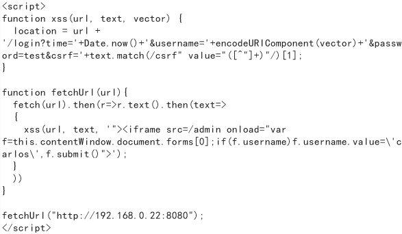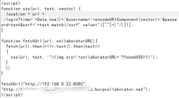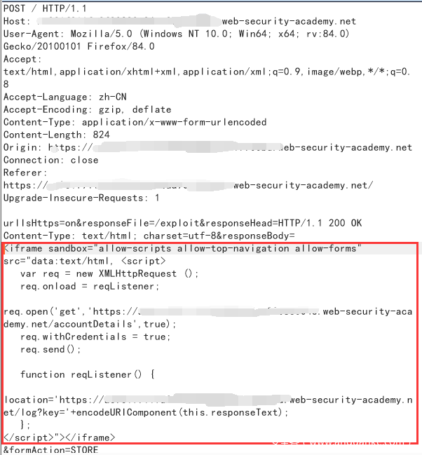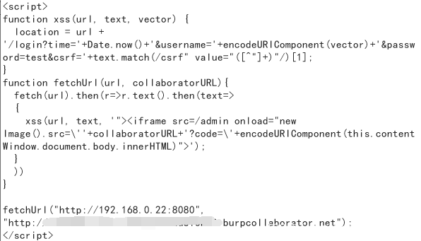 我们看到这个payload很复杂,一共套了三层,最外层是可以向http发送请求并且存在XSS,对后续的利用有帮助,然后里面就是利用上一道靶场的知识构造的将敏感数据发送到指定服务器的操作。