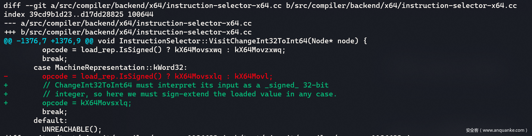 本次代码漏洞出现在VisitChangeInt32ToInt64函数中,也就是在生成ChangeInt32ToInt64的汇编代码时出现的问题,patch之后的代码逻辑是:在kWord32的情况下,无论如何都有带符号位的扩展。