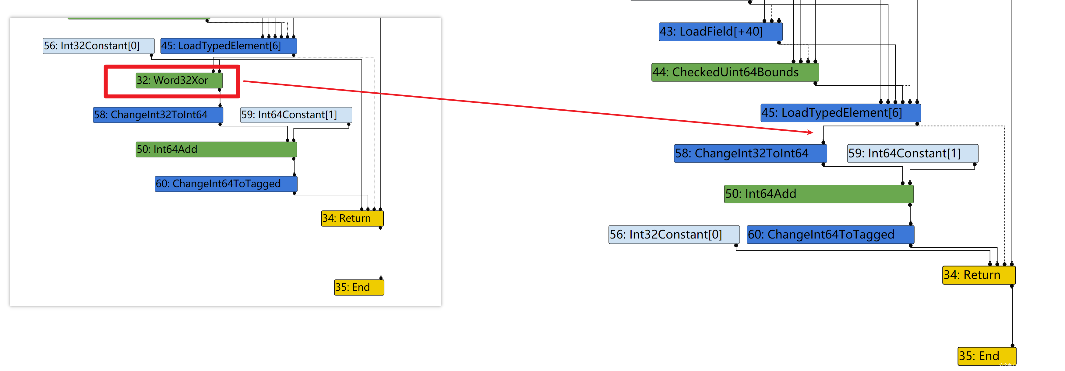 通过上图可以看出,在turbofan优化阶段,会将SpeculativeNumberBitwiseXor转换成Word32Xor与ChangeInt32ToInt64。