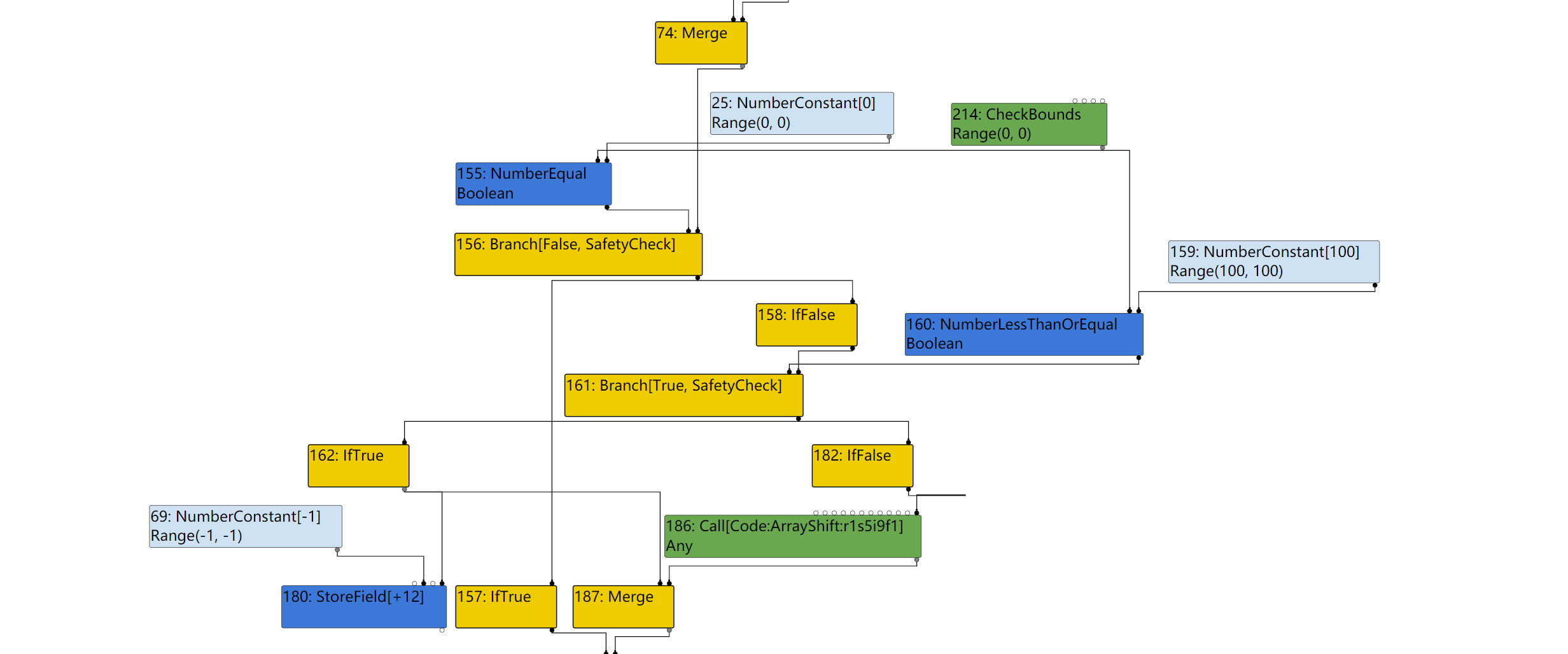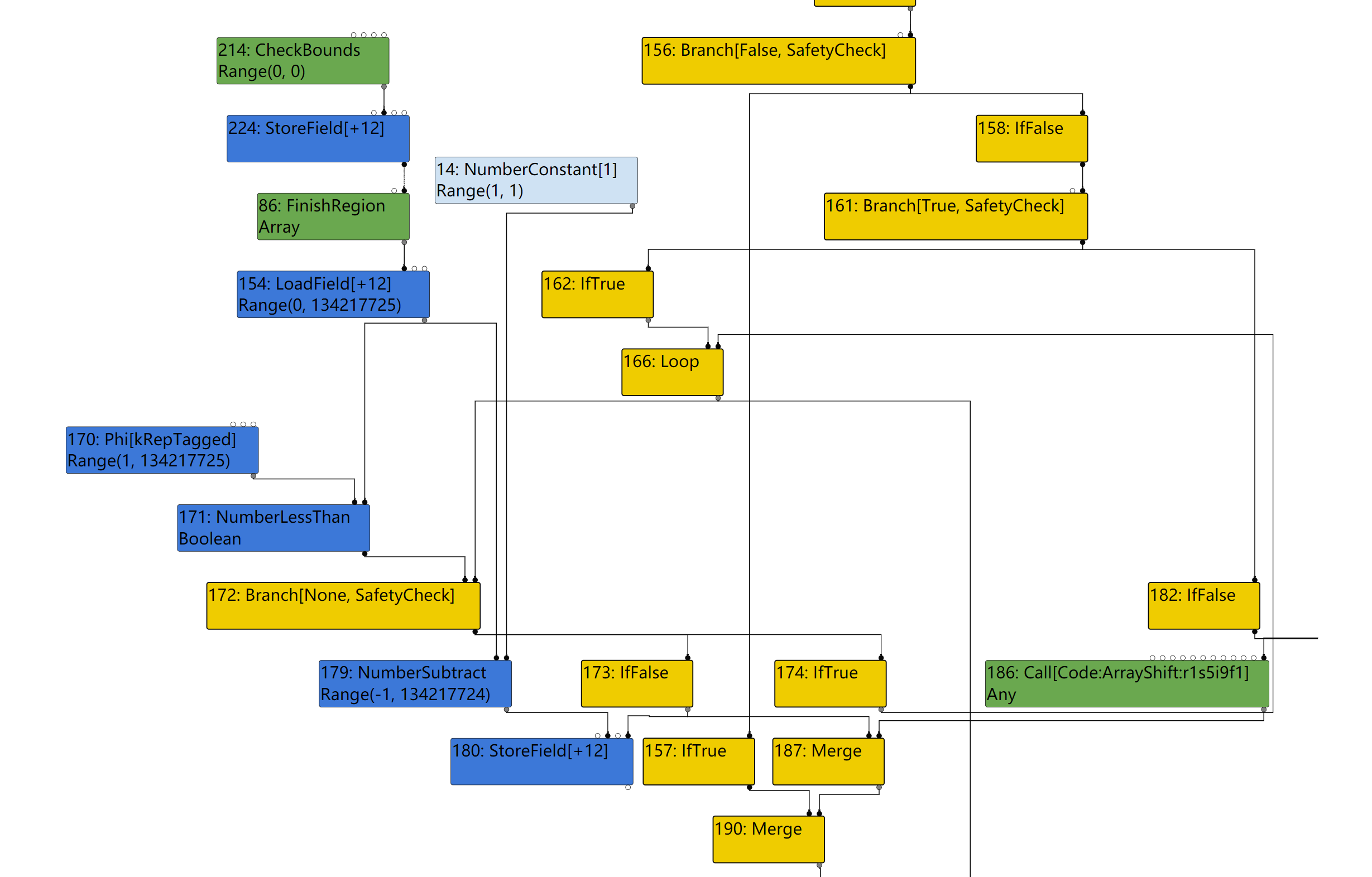 2、创建完js数组之后,控制流便会来到156号节点,而该处节点判断了当前array的长度是否等于0,如果等于0便会从157号ifTrue节点流出,而如果不等于0 ,则会经由158号节点ifFalse流向161号节点,再次检查当前数组是否小于等于100,如果当长度大于100的时候,则会经由182号节点流向186号节点:Call[Code:ArrayShift:r1s5i9f1]。而这里则会调用Array.Prototype.Shift函数的慢路径,当然这不是本次关注的重点。当长度小于100的时候,便会经由162号节点流向166号的Loop,从而进入一个循环,而该处循环的功能则是Inlining后的Array.Prototype.Shift的快路径(详细过程可以参考JSCallReducer::ReduceArrayPrototypeShift的实现,此处不再赘述)。