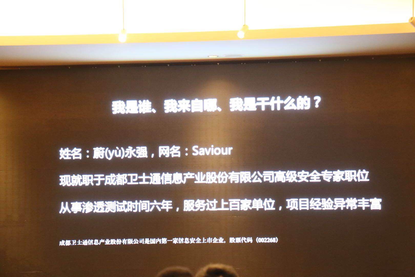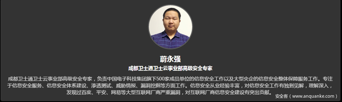 成都卫士通卫士云事业部高级安全专家蔚永强负责中国电子科技集团旗下500家成员单位的信息安全工作以及大型央企的信息安全整体保障服务工作。专注于信息安全服务、信息安全体系建设、渗透测试、威胁情报、漏洞挖掘等方面工作。本次议题分享了他丰富的信息安全从业经验,以及对信息安全工作的独到见解。