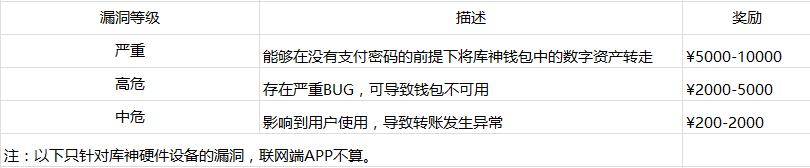 3、找出并上报库神钱包硬件产品安全漏洞,根据漏洞影响的严重性可获得相应等级的奖励。(由库神技术审核人员判断漏洞严重性程度,确定相应奖励)