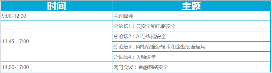 下午,五大分论坛(云安全和电商安全、AI与终端安全、网络安全新技术和企业安全应用、大师讲堂和金融网络安全)将同时进行,网络安全行业各领域最新、最受关注的热点话题以及新技术、新思想将在这里交汇碰撞。