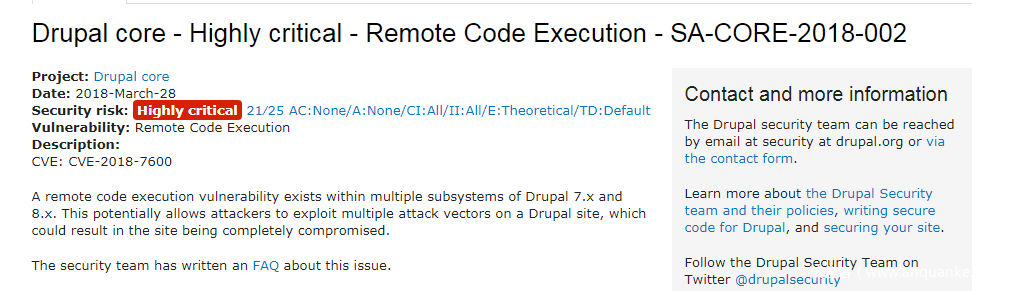 2018年3月28日,Drupal官方发布新补丁和安全公告,Drupal 6,7,8多个子版本存在远程代码执行漏洞(CVE-2018-7600)。