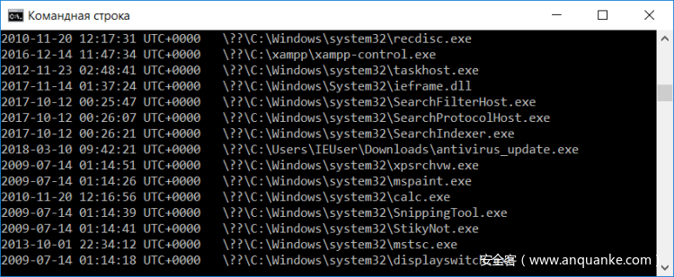 这个程序被执行了两次!看来受害者并不是特别明智。我们也可以通过其他方式来搜索程序执行的证据,比如prefetch(预读取)文件。我们可以在内存中找到这些蛛丝马迹,Volatility也有一个插件能够处理这些文件:prefetchparser。
