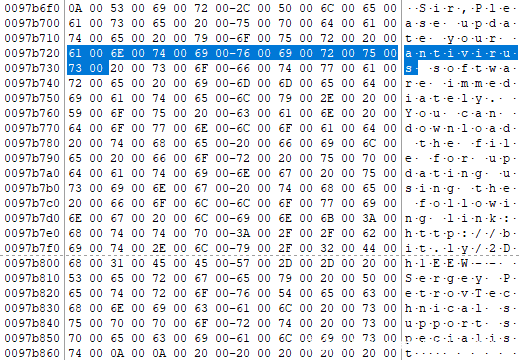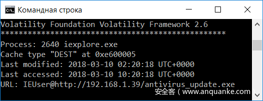 正中靶心!受害者从服务器上下载了antivirus_update.exe这个程序,服务器的IP地址前面我们已经见到过!但他们为什么会这么做呢?我们可以使用memdump插件导出Internet Explorer的进程内存,搜索“antivirus”字符串: