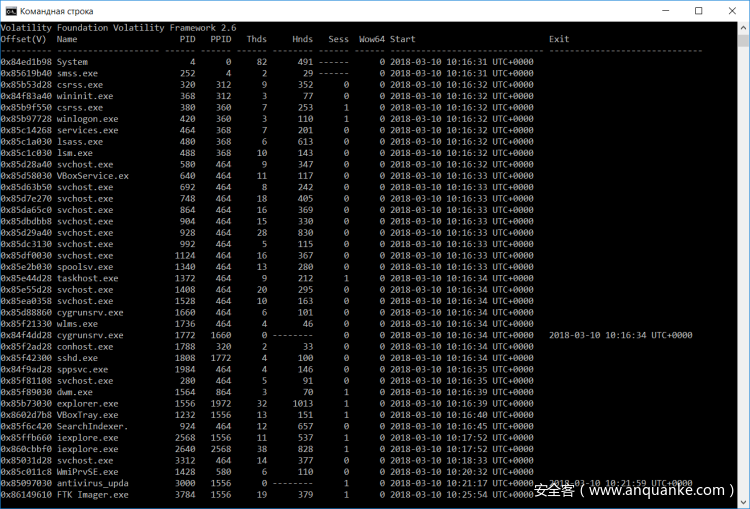 如上图所示,这次实验中Volatility正确猜测出了操作系统的版本:Windows 7 x86 with SP1。现在我们可以使用pslist插件查看进程列表: