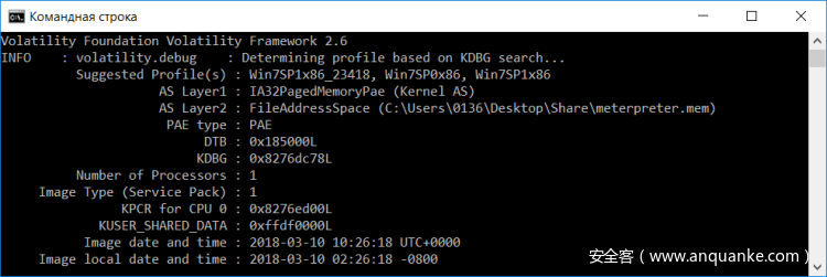 在分析内存映像时,首先我们应当收集操作系统的信息,以选择正确的Volatility配置。比如,这里我们最好在生成内存映像过程中收集操作系统版本信息,因为Volatility并不能确保每次都能正确检测到这个值。此外,如果我们从第三方那获取到内存映像,无法得知操作系统版本信息,那么我推荐大家使用imageinfo这个插件: