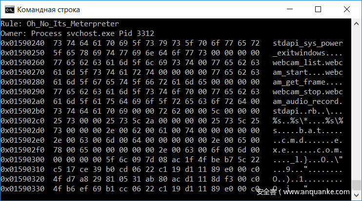 貌似Meterpreter已经与svchost.exe融合在一起,PID为3312。我们可以将其导出到一个文件中,看一下恶意软件对这个文件的检测情况: