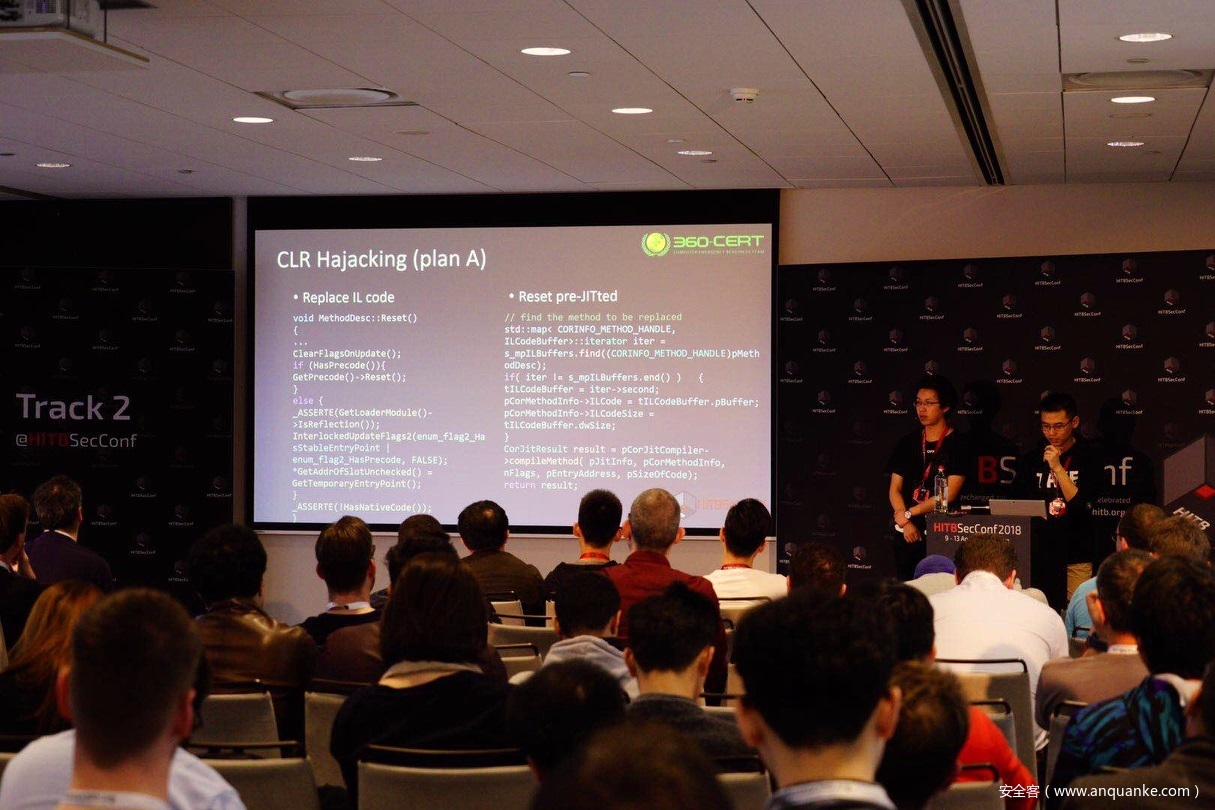 来自360CERT的360CERT安全分析团队负责人洪宇和360CERT安全研究员邢士康带来了“Attacking Microsoft .NET Framework through CLR”软件安全方面议题演讲,演讲主要是通过研究微软.net中的CLR环境,以寻找.net应用漏洞的通用性攻击思路。