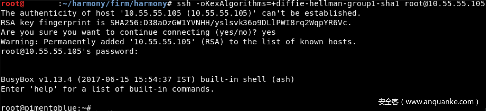 我们创建了带有.pkg扩展名的一个恶意压缩文档,使用本地web服务器托管该文档。当下一次Harmony Hub根据被篡改的GetJson2URIs响应包中给出的URL地址来检查更新时,我们返回经过修改的响应包,指向这个更新文件。Harmony Hub会接收我们提供的恶意软件更新包,重启Harmony Hub后就会启用SSH接口。这样我们就可以使用root用户名以及空密码来访问该设备,如图16所示。