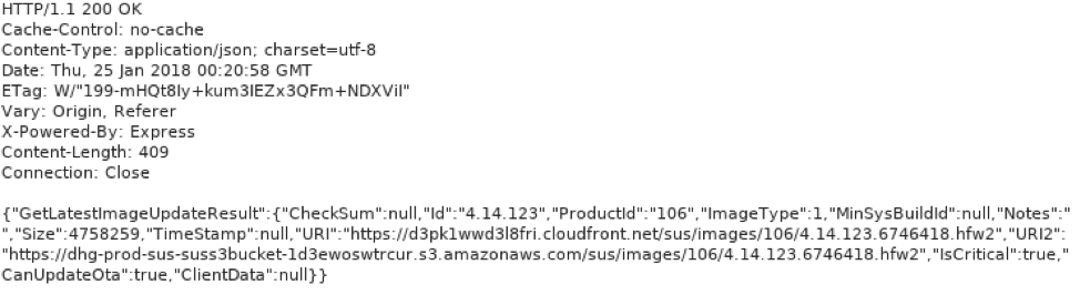 如果POST请求正文中的sysBuild参数与服务器已知的当前版本不匹配,服务器就会响应一个初始数据包,其中包含新软件包版本信息。由于某些不知名的原因,Harmony Hub忽略了这个初始响应包,发送了第二个请求。第二个响应包中包含多个URL地址,这些地址指向了新的软件包,如图12所示。