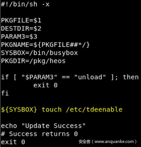 manifest文件中installer参数所指定了一个脚本,如果压缩文件中存在该脚本,那么Harmony Hub在更新过程中就会执行这个脚本。我们修改了这个脚本,如图15所示,修改后该脚本会创建/etc/tdeenable文件,前面提到过,这样启动过程就会启用SSH接口。